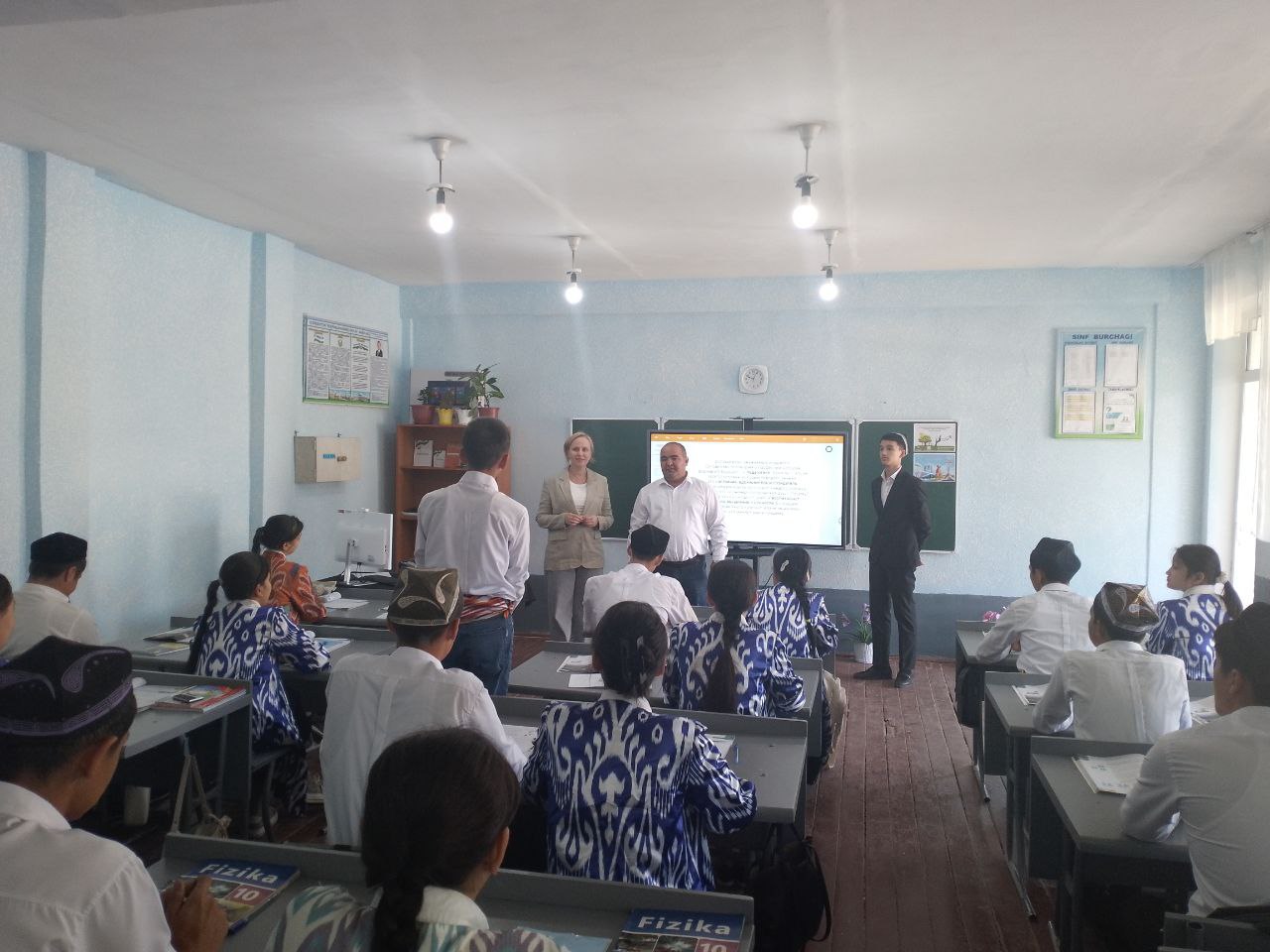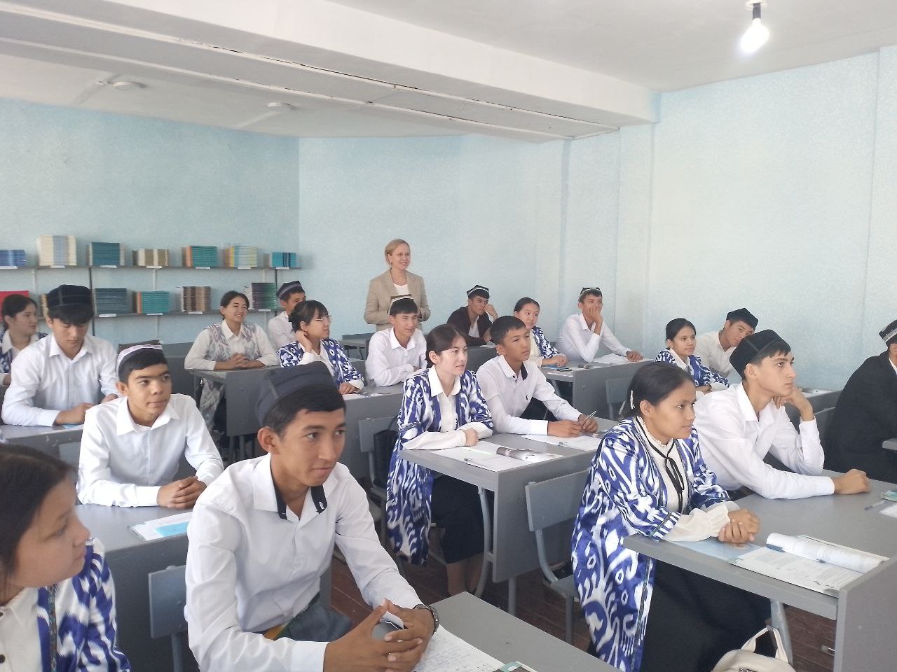 По приглашению Нодира Усманова, слушателя программы повышения квалификации Центра педагогического мастерства, учителя русского языка как иностранного и классного руководителя 10 «А» класса, методист проекта «Класс!» («Зўр!») Диляра Халилова посетила школу № 32 Сайхунабадского района.