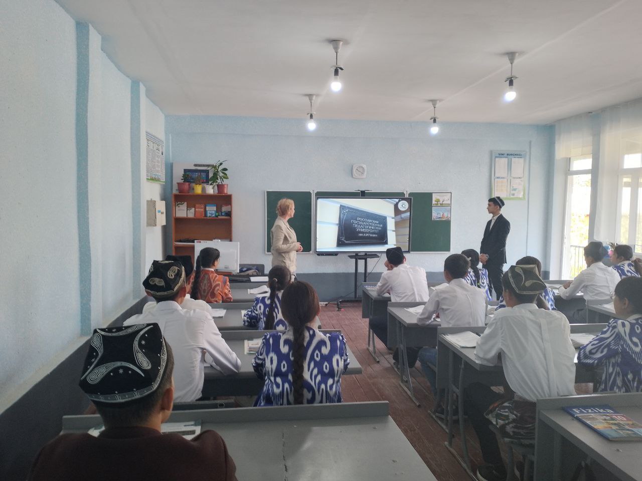В рамках визита состоялась встреча с директором школы и учащимися трёх классов: 10 «А», 9 «А» и 6 «А». Для старшеклассников методист провела презентацию «Педагог – инженер человеческих душ», дополненную видеоматериалами о педагогических вузах России и Узбекистана. После выступления развернулась оживлённая дискуссия: школьники активно задавали вопросы и делились планами поступления в вузы, рассказывали о своих профессиональных устремлениях. Особенно интересным стал разговор о том, кто из ребят планирует связать свою жизнь с педагогической деятельностью.